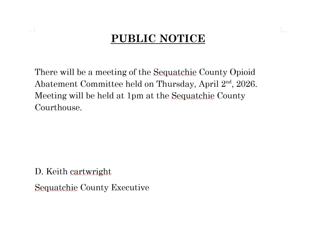 Sequatchie County Opioid Abatement Committee will have a meeting on April 2nd, 2026. This meeting will be held at the Sequatchie County Courthouse at 1pm.