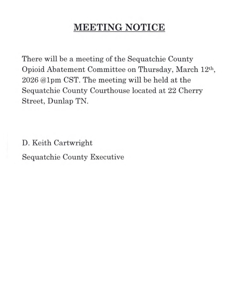 Sequatchie County Opioid Abatement Committee on Thursday, March 12th, 2026 at 1pm CST.