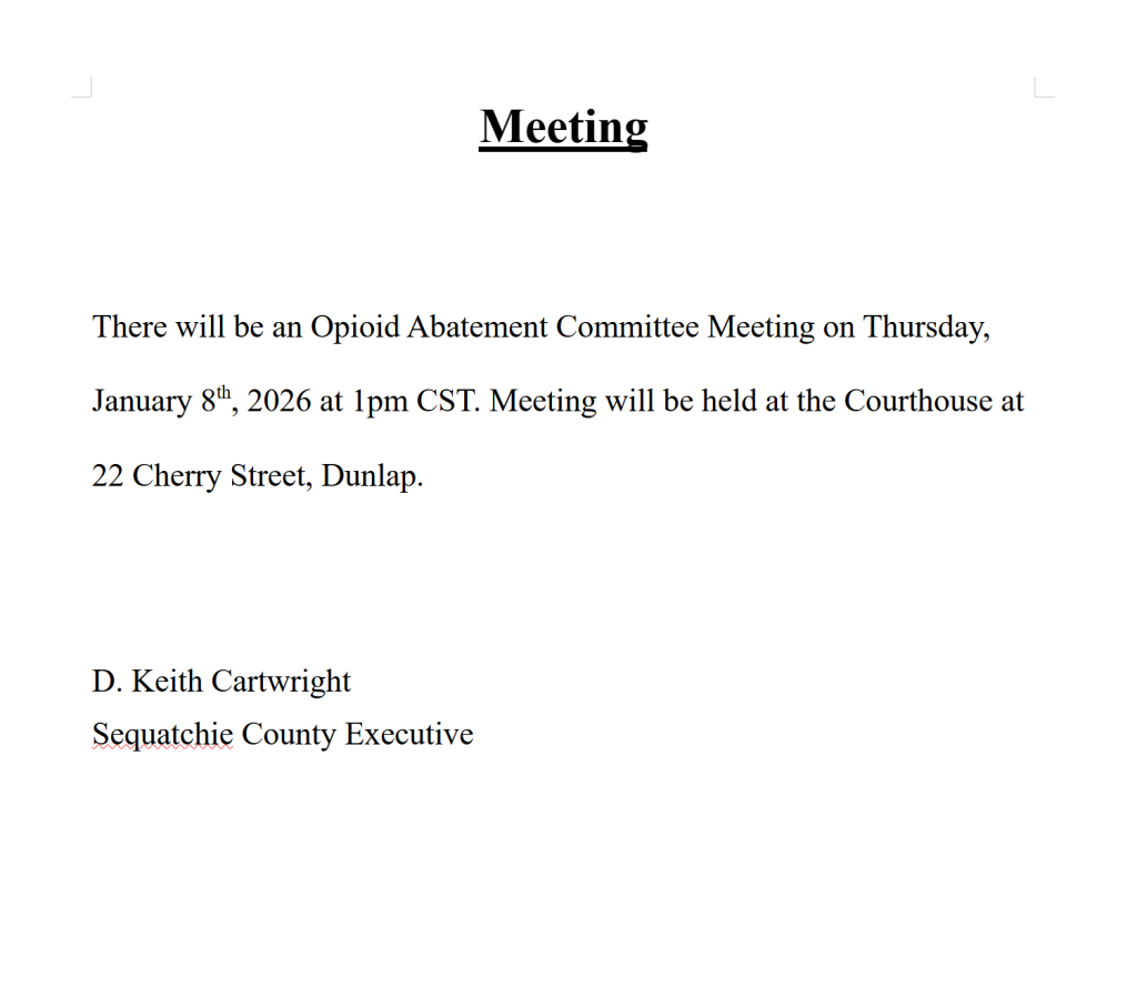 Opioid Abatement Committee Meeting will be held on Thursday, January 8th, 2026 at 1 pm CST.