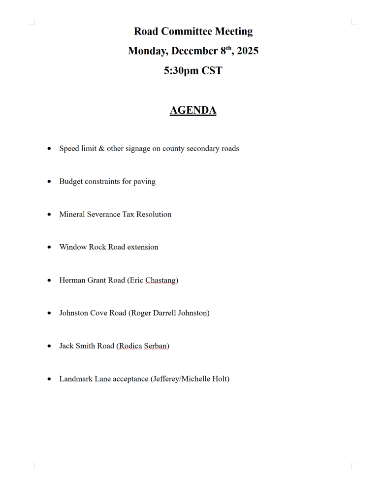 The Road Committee Meeting Agenda for December 8th, 2025.