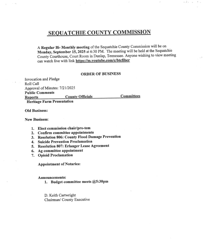 The Sequatchie County Commission Meeting Agenda for September 15, 2025. Anyone wishing to view this meeting can watch live with the link attached below