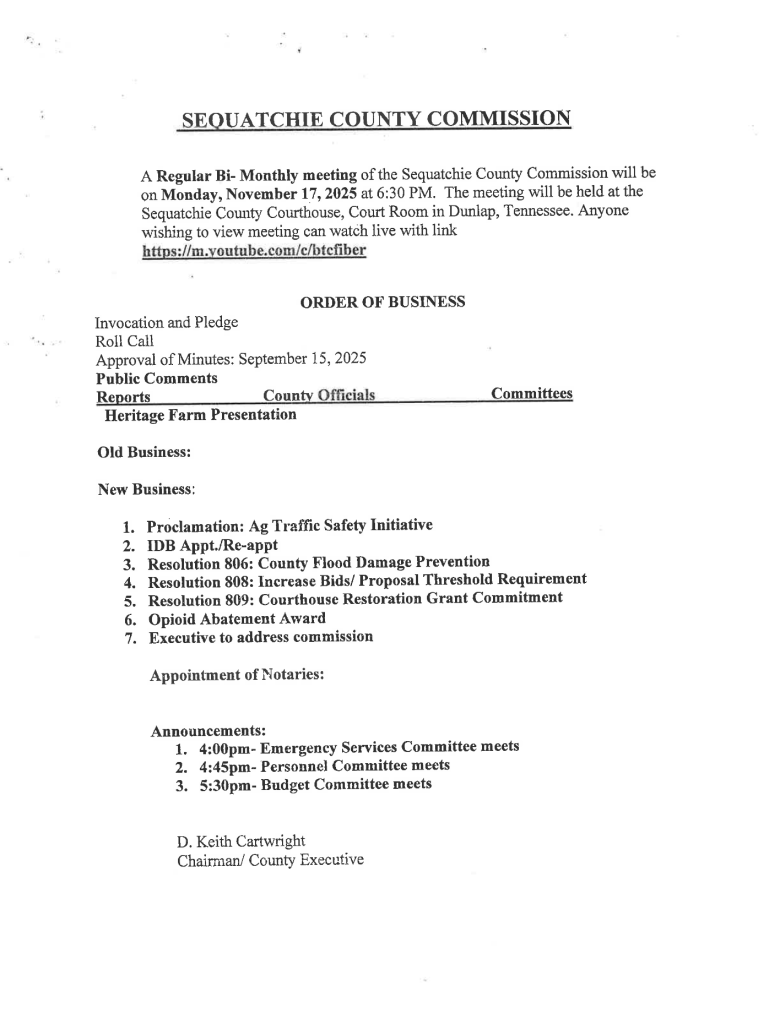 Sequatchie County Commission Meeting Agenda for November 17, 2025. Anyone wishing to view this meeting can watch live with the link attached below.