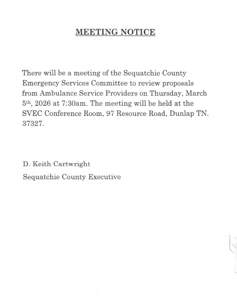 Sequatchie County Emergency Services Committee will be meeting March 5th, 2026 at 7:30 am CST. This meeting will be held at SVEC in the conference room.