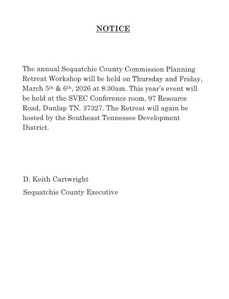 The Sequatchie County Commission Planning Retreat Workshop will be held March 5th and 6th, 2026 at 8:30am CST. This year it will be held at SVEC Conference room.